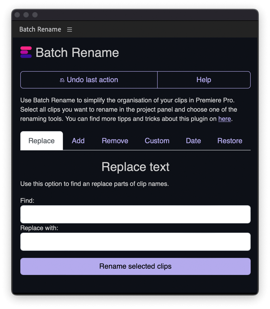 Le plugin "Batch Rename" est disponible pour Adobe Premiere Pro et te permet de nouvelles possibilités pour simplifier l'organisation des clips et des sources dans ton projet. Sélectionne tes clips et utilise le plugin pour renommer tes clips par lots plus rapidement. Remplace les mots dans tes fichiers sources ou ajoute des dates et du texte personnalisé aux noms de tes clips. Le plugin offre plus d'options pour optimiser les grosses productions Premiere Pro. Optimisé pour les besoins des assistants monteurs.