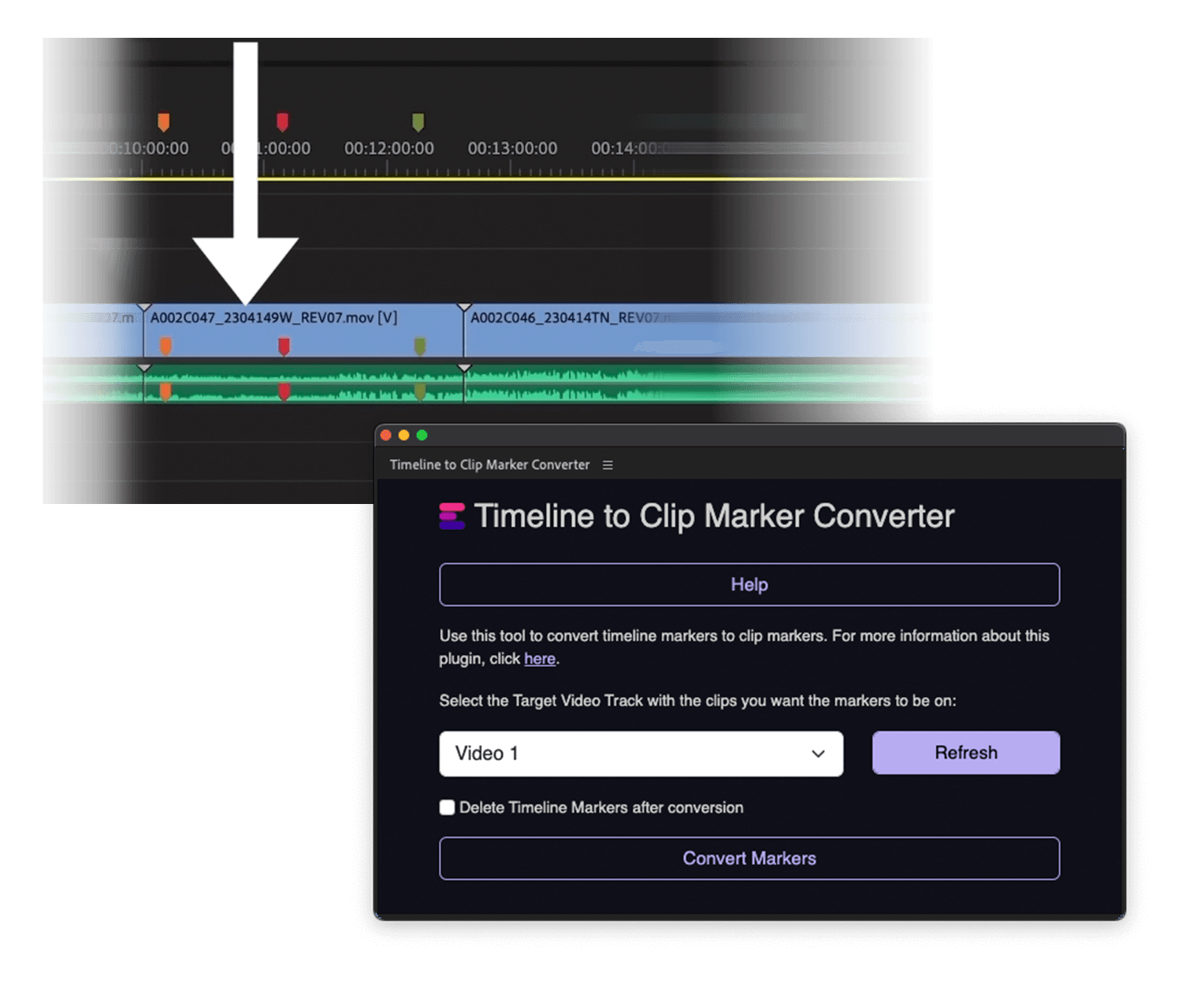 Avec ce plugin, tu peux facilement convertir tous les marqueurs de la ligne de temps en marqueurs de clip. Tu peux également sélectionner le calque vidéo où les placer et supprimer automatiquement les marqueurs de ligne de temps après la conversion. Utilise ce plugin pour placer tous les marqueurs temporels sur les clips vidéo.