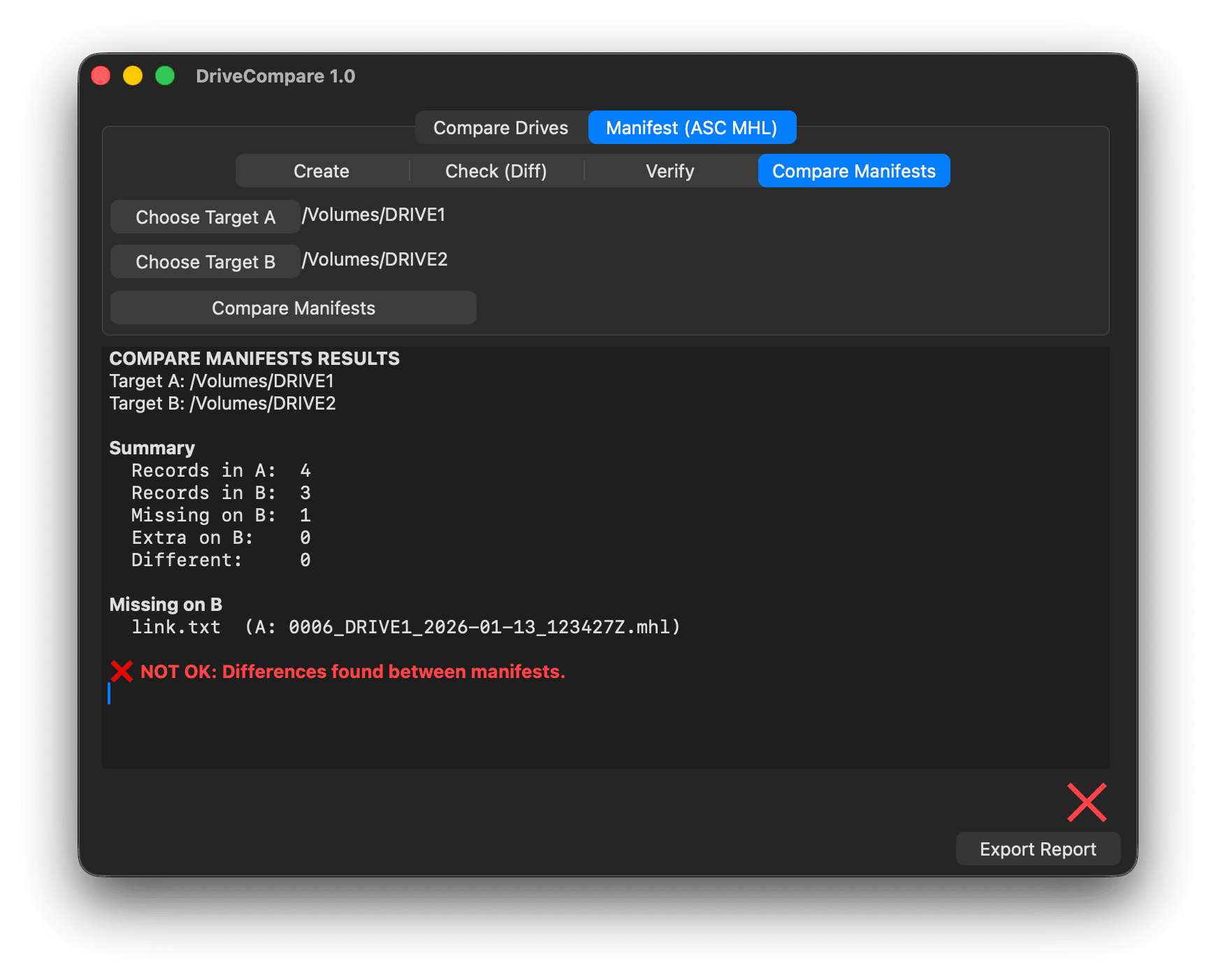 ASC MHL (Advanced Storage Comparison – Manifest Handling Layer) is an industry-standard format for recording file metadata such as paths, hashes, sizes, and timestamps. DriveCompare can create, check, verify, and compare ASC MHL manifests.
