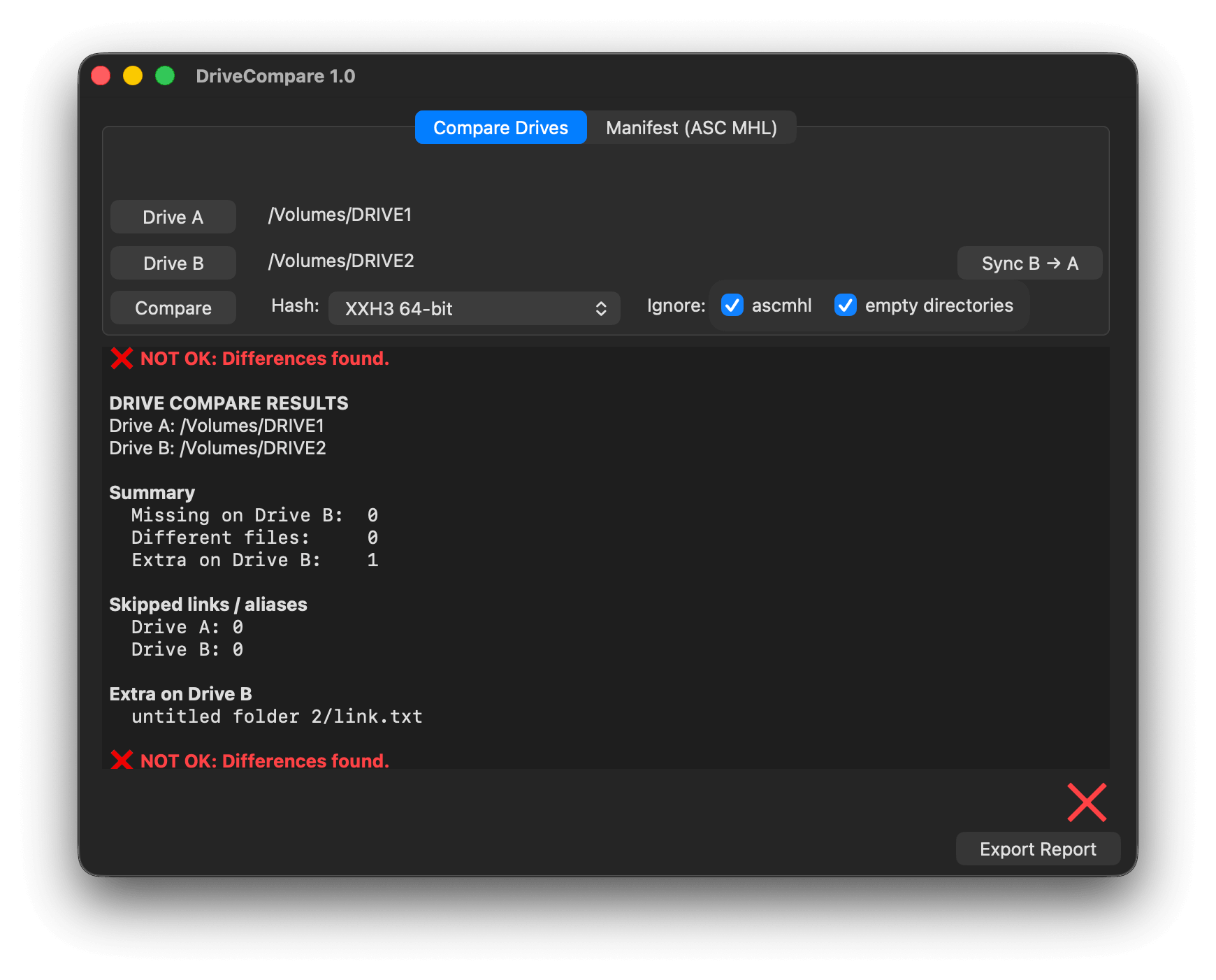 Select which 2 drives or directories you want to compare and choose the hash type. If None is selected it will only compare names and file sizes, but not check that the files are exactly the same. You can ignore ASC MHL directories and empty directories.