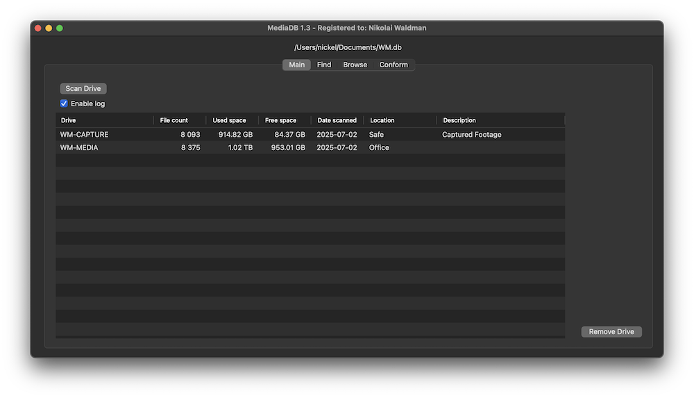 MediaDB is an essential tool for small post production houses and freelancers who work with large quantities of hard drives and discs. The app helps create a database of all the hard drives and files in use. It allows you to search for files and browse directory trees while the drives are offline. MediaDB can also be used to create an RCP file for DaVinci Resolve from an EDL during the film conforming process.
